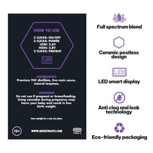 Be the highest in the room with Hex Extracts. Where innovation meets elevation, our 2-gram blend of live resin and cannabinoid enhanced distillate delivers a smooth, full-spectrum high that just hits different. Each formulation is unique and meticulously crafted for a signature experience. Metal- and cotton-free, the ceramic postless design delivers pure, flavorful hits and never clogs or leaks, while the LED screen with puff timer gives you precise control. Packaged in 100% recyclable paper boxes, Hex Extracts is as smart as it is potent.