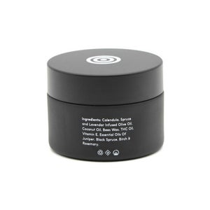 Ingredients: Calendula, Spruce, & Lavender Infused Olive Oil, Coconut Oil, Beeswax, THC Oil, Vitamin E & Essential Oils of Juniper, Black Spruce, Birch, & Rosemary